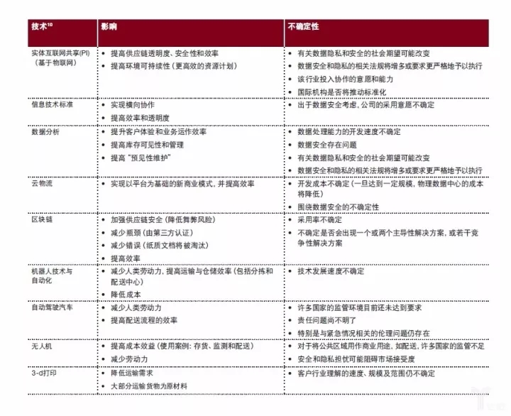 下表是一些新兴技术对物流行业的影响以及存在的不确定性: