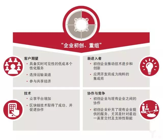 企业初创、重组:在本场景下,采用初创企业形式的新进入者会产生更大影响。特别是,最具挑战性且花销大的最后一英里交付趋于分散化,正进行新技术开发(如平台和众享解决方案)。这些初创企业与现有企业协作,并互补服务产品。
