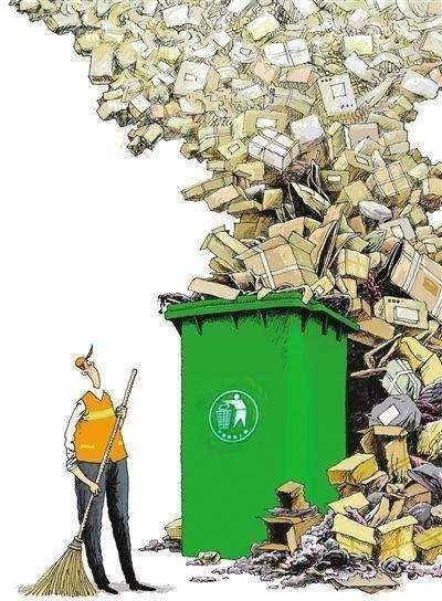 快递行业逐渐壮大,快递产出的垃圾越来越多,问题不容忽视。仅以包装为例,就包括快递运单、编织袋、塑料袋、封套、包装箱、胶带以及内部缓冲物七大类。在2012年,全年57亿快递总量,包装使用的胶带总长可以绕地球赤道116圈。过量包装不仅会造成环境污染,还带来极大的资源浪费。