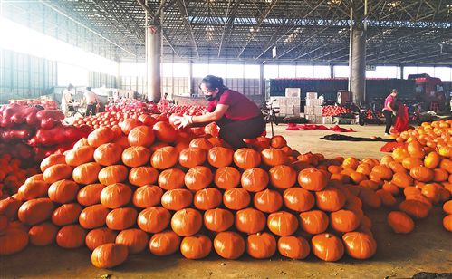 山东寿光地利农产品物流园里,工作人员正在码放南瓜。