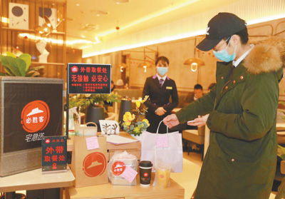1月30日起,肯德基宅急送和必胜客宅急送在全国范围内同时推出“无接触配送”服务。2月1日起,部分肯德基餐厅试点“无接触点取餐”服务。顾客完成点餐后,凭取餐号在柜台领取自己的餐点,部分餐厅还配备自取货架,方便消费者自行取用餐点。必胜客外带也采取类似措施,顾客自助点餐后,凭取餐号在餐厅“外带取餐处”取餐。