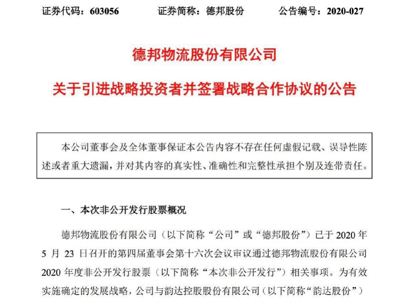 交易完成后,韵达将持有德邦股份的股权比例约为6.5%,并将向德邦股份委派一名非独立董事。