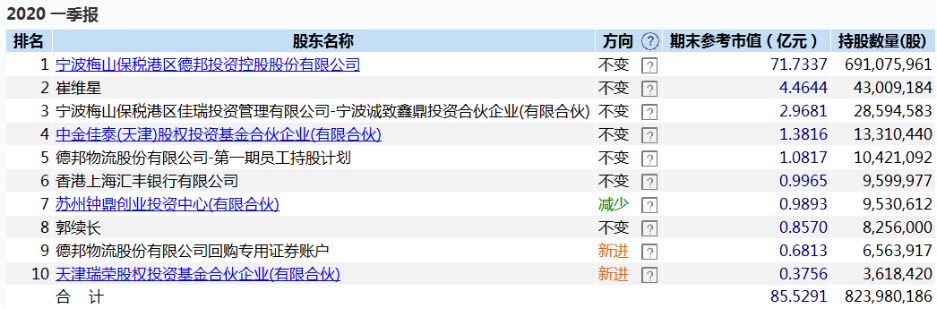本次非公开发行前,截至2020年一季末,德邦股份的最大控股股东仍是宁波梅山保税港区德邦投资控股股份有限公司,持有德邦股份71.99%股权,德邦快递董事长崔维星直接持股为4.48%,为德邦股份实际控制人,控股权合计为76.47%。