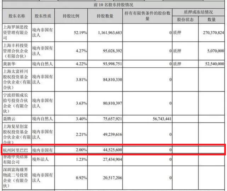 4 月 29 日,韵达股份在发布 2019 年财报时也披露了最新的持股结构,股东名单中意外出现了阿里的身影。财报显示,截至一季度末,杭州阿里巴巴创业投资管理有限公司持有韵达2% 的股份,位列第七大股东。