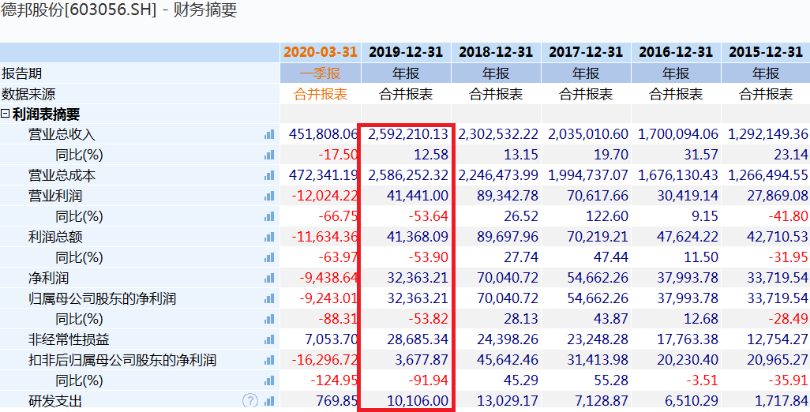 根据德邦4月30日公布的2019年财报,2019年全年,德邦股份实现营业收入259.22亿元,同比增长12.58%;但净利润却同比下滑-53.82%至3.24亿元。