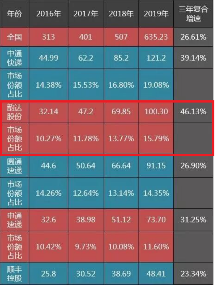 同时,韵达也是快递巨头中过去四年中发展最快的快递企业。
