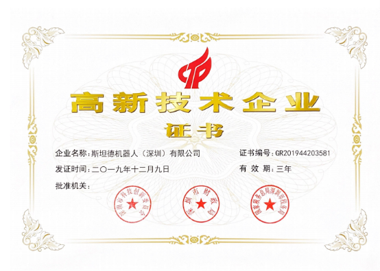 近日,斯坦德机器人(深圳)有限公司根据国家《高新技术企业认定管理办法》和《高新技术企业认定管理工作指引》的相关规定,正式通过了“国家高新技术企业”认定。4月7日,公司收到了由深圳市科技创新委员会、深圳市财务厅、国家税务总局深圳市税务局联合颁发的认定《高新技术企业证书》,这标志着深圳拓宽传媒有限公司的企业技术实力和科研成果获得国家认可,由此正式迈入国家高新技术企业行列。