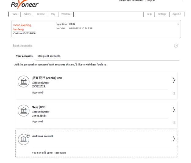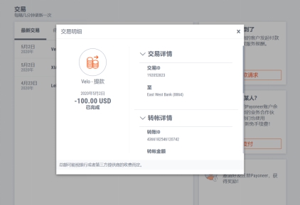 绑定成功后,可以方便地从Payoneer提现到Velo账户。请注意,提现的费用是提现金额的1.2%。