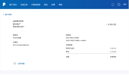 绑定成功后,就可以从PayPal提款到Velo,这是我自己操作的一笔测试提款。请注意,从PayPal账户提现的费用是35美元。