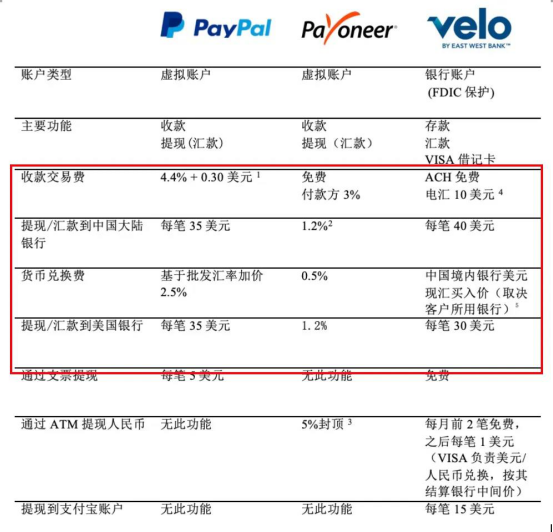 可以看到,PayPal收款交易费为4.4%+$0.3/笔,提现至中国大陆的银行为35美金/笔。Payoneer虽然没有收款交易费,但提现到中国大陆的银行手续费为1.2%,而且,付款方需要支付3%的交易费,它可以选择把这笔费用转嫁给收款方。相比之下,Velo没有收款交易费,提现至中国大陆的银行为40美金/笔。