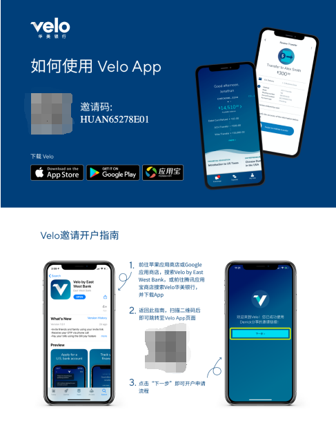 只需要下载“Velo华美银行”手机App,并且有一个中国身份证,无需亲临美国、无需护照或美国签证、无需美国地址和电话,即可足不出户,几分钟内完成手机在线开户,获得真正的美国本土的银行账户。