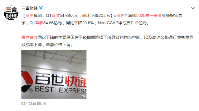 但就在物流行业再起步的同时,一位知名快递巨头却陷入了困境,这位快递巨头正是百世快递。根据百世快递公布的第一季度财务报告显示,该公司在2020年Q1实现营收54.66亿元,同比下滑20.5%,净利润为-7.12亿元,相比2019年同期的亏损金额大涨222%。