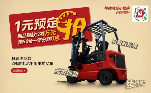 大手笔省钱!大力薅毛!林德商城小程序新品超大波活动预热开启,仅1元预定即可抢尾款立减万元。前50台车申请一年分期还能享受0息,赶紧上车吧!