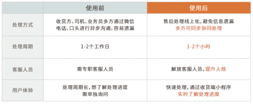 该产品可以通过多端协同,实现客服流程线上化、一键审批、多方信息实时同步、收货人随时查看处理进度,从而缩短处理周期,提升客户体验及满意度。