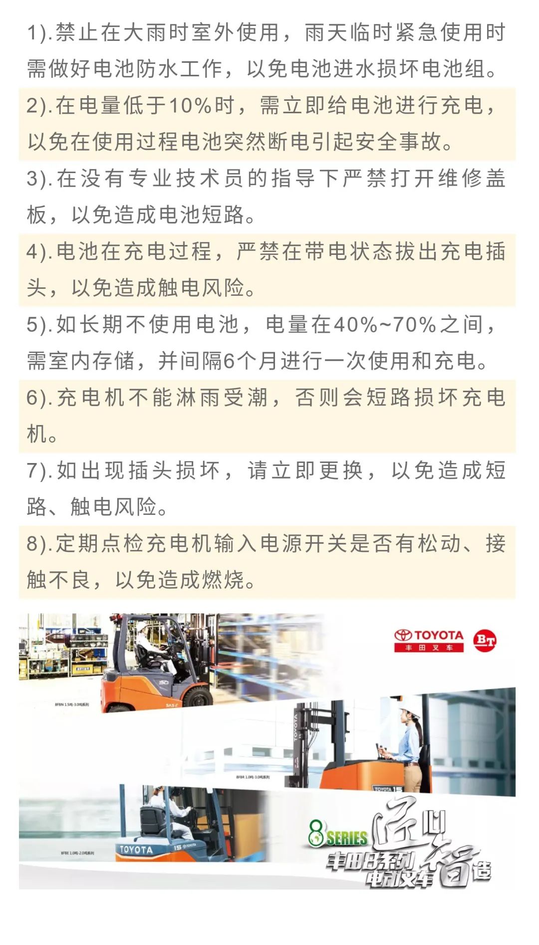 与此同时,锂电池车辆的生产标准和市场规范还待完善,中国工程机械工业协会也正在出台相关的行业标准。作为全球领先的叉车品牌,丰田叉车将为大家分享在全球范围积累的丰富经验,帮助客户更加安全、安心、高效地导入锂电池解决方案。