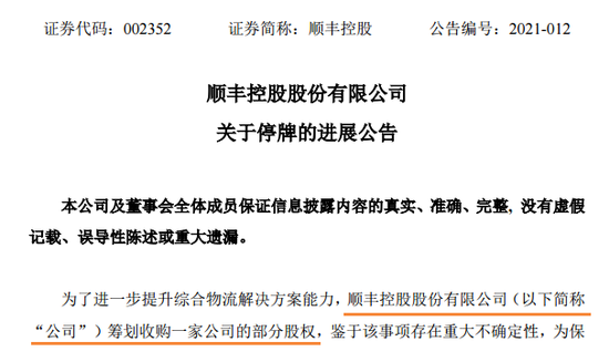 午后,顺丰控股披露了停牌进展公告,称为了进一步提升综合物流解决方案能力,正筹划收购一家公司的部分股权,预计停牌时间不超过5个交易日。