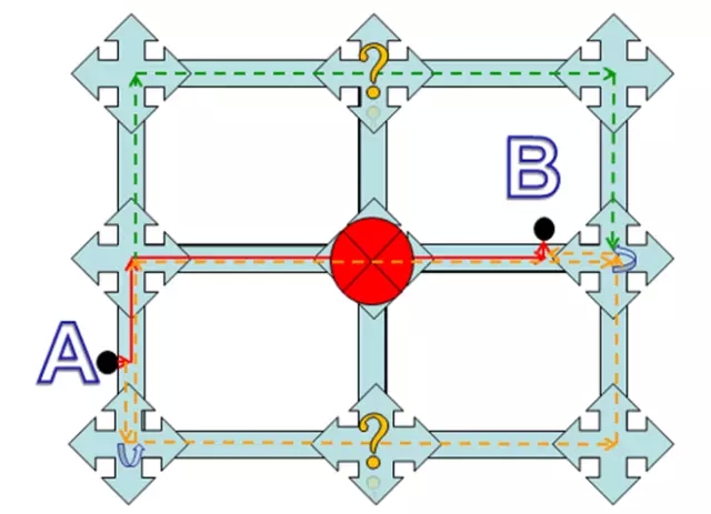 从A到B的运输,有很多线路可以选择,我们发现最短的是红色的这条,但是我们现在很多的城市干道,路中间有隔离(出门只能右转),所以我们需要在这个路口掉头,这里会形成有两条橙色的线路,这是正常情况。但是,这个时候发现在这个(红色打叉)路口现在出现了事故,比如现在的实时路况报某个路口出现交通事故,堵塞,此时就有两种选择,不能走这条路(红色),但是这条路(下方橙色)是一条连续左拐的路,受红灯限制较多,而上方绿色的这条线没有左拐基本都是右拐,如果红绿灯时间比较长的时候,这条线就是最短的。这两条线同时还要经过几个路口,如果因为中间的路口堵塞导致其他几个路口也会存在拥堵,我们就仅从实时路况无法做出正确的选择。