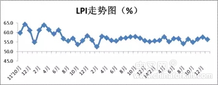 中国物流与采购联合会发布的2015年1月份中国物流业景气指数(LPI)为56.3%,比上月回落1.2个百分点。业务总量指数、新订单指数、平均库存量指数、库存周转次数指数、资金周转率指数、设备利用率指数、物流服务价格指数、主营业务利润指数、从业人员指数、固定资产投资完成额指数指数和业务活动预期指数均有不同程度回落。