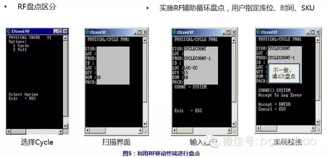 产品盘点:首先在系统软件设置好盘点任务,盘点人员从RF中获取按库位、区域或SKU生成的环盘点任务,利用RF手持终端扫描库位条码,显示待盘点产品型号及对应数量,系统比对后即时生产盘点结果,从而提高作业效率。