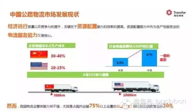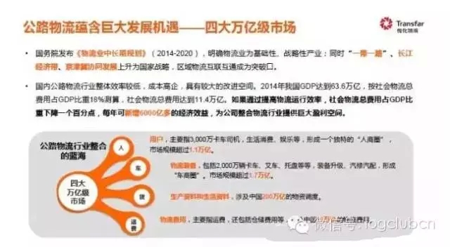 目前真正的有车承运人是卡车司机,国家正在推行各种各样的政策,推动物流的发展,物流业迎来了非常好的发展时机。物流行业存在四万亿元的市场,市场要素由四个方面:第一是用户,第二是物流装备,第三是生产资料和生活资料,第四是物流费用。