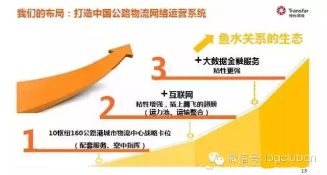 首先,依托10枢纽160基地,打造公路港城市物流中心,形成全国快运网络。目前已经投入运营的有5个公路港,2015年计划新开业6个,2015年正在建设8个,目前已经在全国17个省市落实的项目有70个。