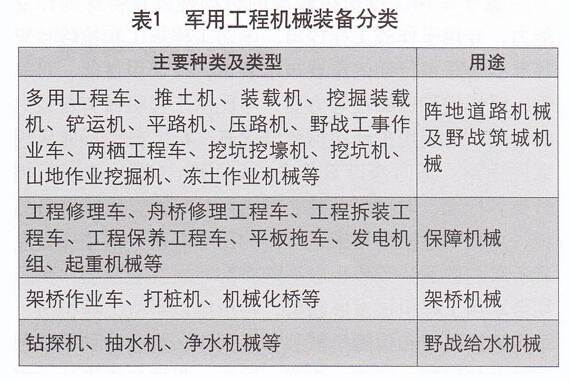 ——修订军用工程机械类组划分表中,增加军用工程机械两栖类装备,表1列出了我国军用工程机械装备型号分类、作用与用途;