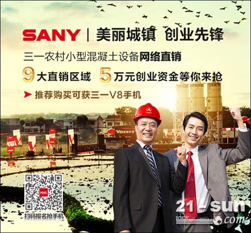 2015年12月底,三一重工“V8城镇先锋混凝土成套设备”将试水网络直销,降低购买门槛,让更多有创业梦想的农村建设者能够购买到这套设备。值得一提的是,这是三一重工首款混凝土设备试水网络直销。“再造100个千万富翁,就在三一V8城镇先锋成套设备这个平台上”三一重工的口号分外提振人心。