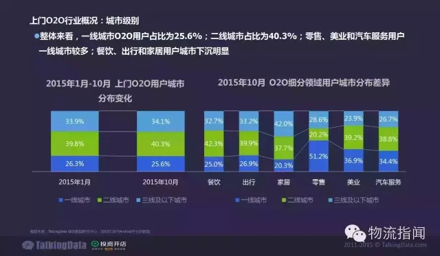 报告还对用户的分布以及行为习惯进行了分析。上门O2O用户分布以东南沿海地区为主;对比今年年初,广东的上门O2O用户增长最快,占比达到15.4%;四川、天津和浙江等地的用户也不断增长。整体来看,一线城市O2O用户占比为25.6%;二线城市占比为40.3%;零售、美业和汽车服务用户一线城市较多;餐饮、出行和家居用户城市下沉明显。