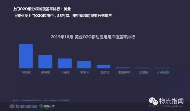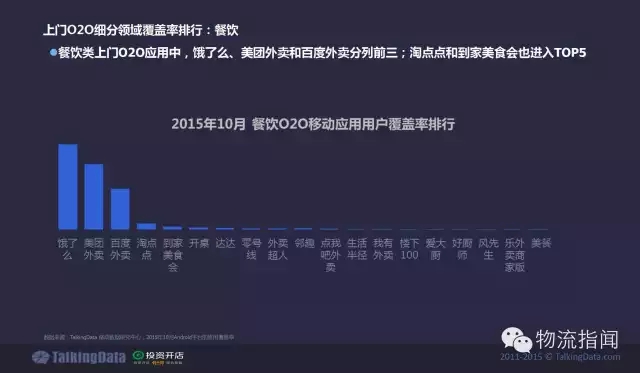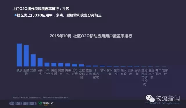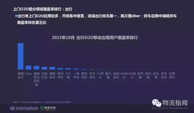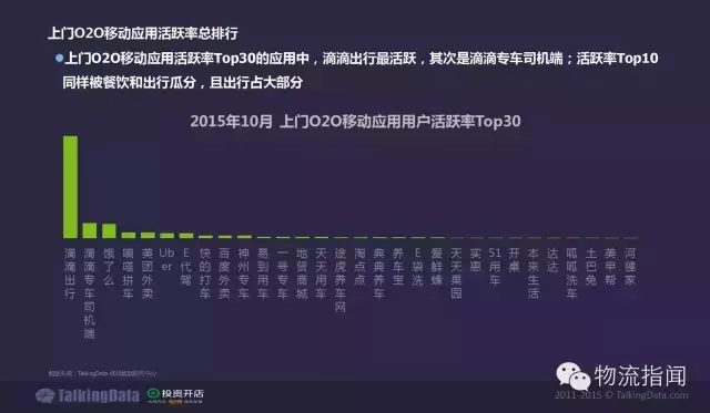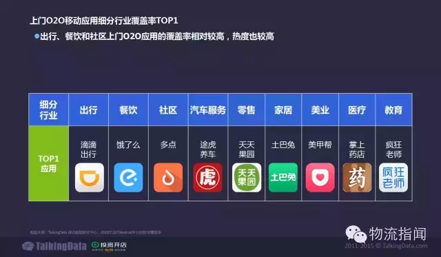 报告指出:上门O2O移动应用覆盖率Top30的应用中,滴滴出行占比最高、其次是餐饮类应用饿了么,TOP10应用被出行和餐饮两个细分领域瓜分。出行、餐饮和社区上门O2O应用的覆盖率相对较高,热度也较高。