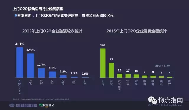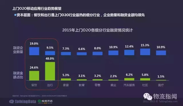 另外,上门O2O企业受资本关注度高,融资金额近300亿元。餐饮和出行是上门O2O行业最热的细分行业,企业数量和融资金额均领先。餐饮企业融资金额占比24.6%,融资企业数量占比19%;出行企业融资金额占比48.0%,融资企业数量占比9.5%。