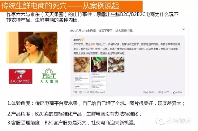第三,客服受理角度,这个六六投诉,京东肯定不能受理,肯定是要转到天天果园,用户没有耐心,一旦没有耐心,一旦有问题,马上会在社交圈里面去吐槽,一吐槽你的产品,你的销售马上受到影响。