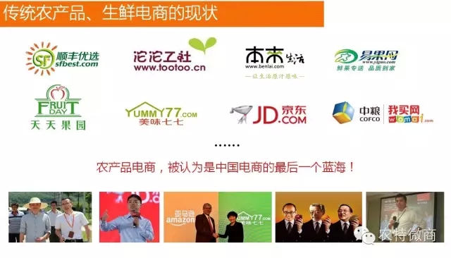 有那么多的电商平台,我们想一下,有哪一家赚钱?其实,有很多大品牌都不赚钱,为什么?用平台B2C的思维做电商,这种交易究竟为什么不能赚钱,我今年就在思考。所谓的互联网改变的农业,其实就是供应链重组,扁平化,这是一个关键问题。都说吃货是一个蓝海,我们每个人1/3的工资是被吃掉的,所以怎么把这个打通。很多大佬都在涉及这个领域,包括顺丰王卫、包括某些地产商、包括潘石屹(潘苹果)和柳传志(柳桃),整个大的格局里面都在探索这一块。