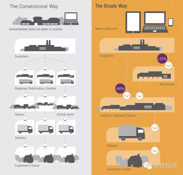供应链模式,灰色部分是传统供应链模式,是从农场到供应商到每一个RDC,然后到整个门店,然后配送到每个用户手里。橙色的是新的模式,整个供应链扁平化,85%的订单朝FC,是整个运转中心,而且有机器人在里面作业,门店里面的订单15%,线上走O2O,线下走扁平化,这是整个供应链的变革趋势。