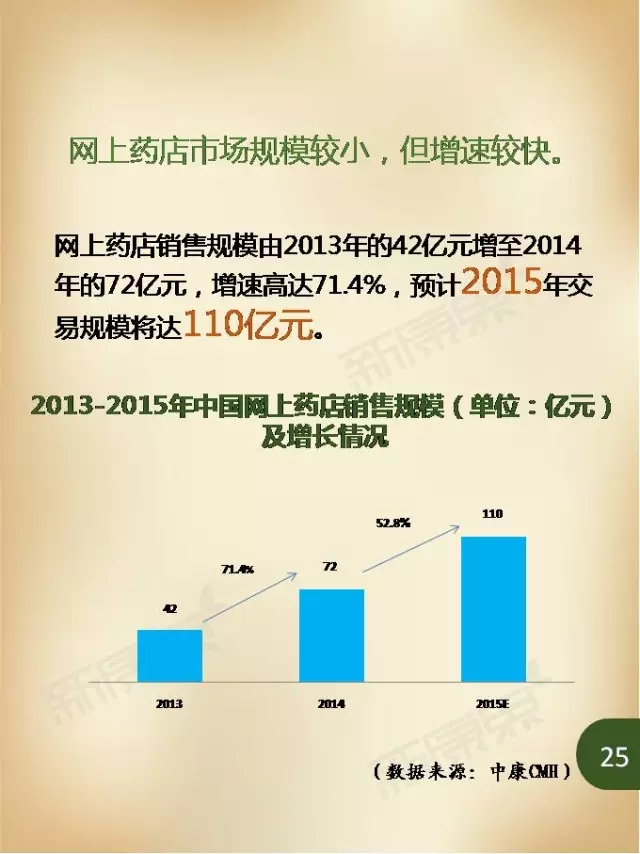 从目前来看,网上药店市场规模虽然不算大,但增速较快。2013年,网上药店销售规模为42亿元,2014年该数字为72亿元,预计2015年交易规模将达110亿元。