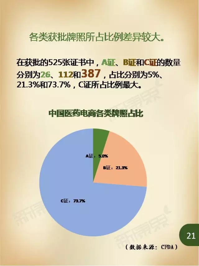 截至2016年1月31日,获得医药网上交易资格证书的企业有525家。其中,A证、B证和C证的数量分别为26、112和387,占比分别为5%、21.3%和73.7%,C证所占比例最大。