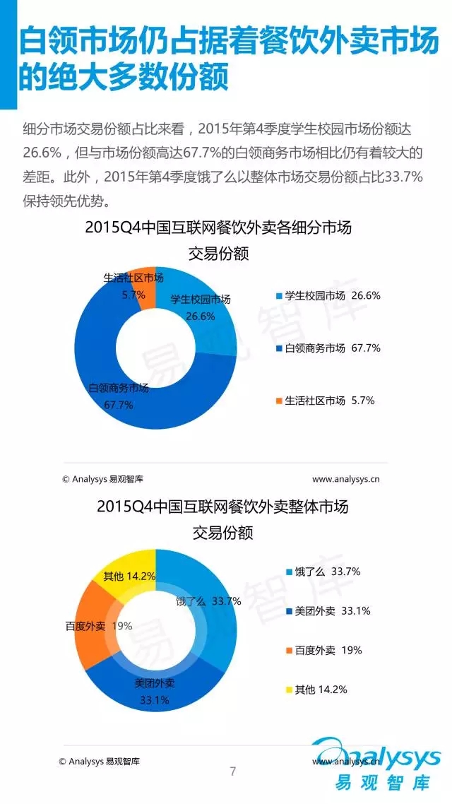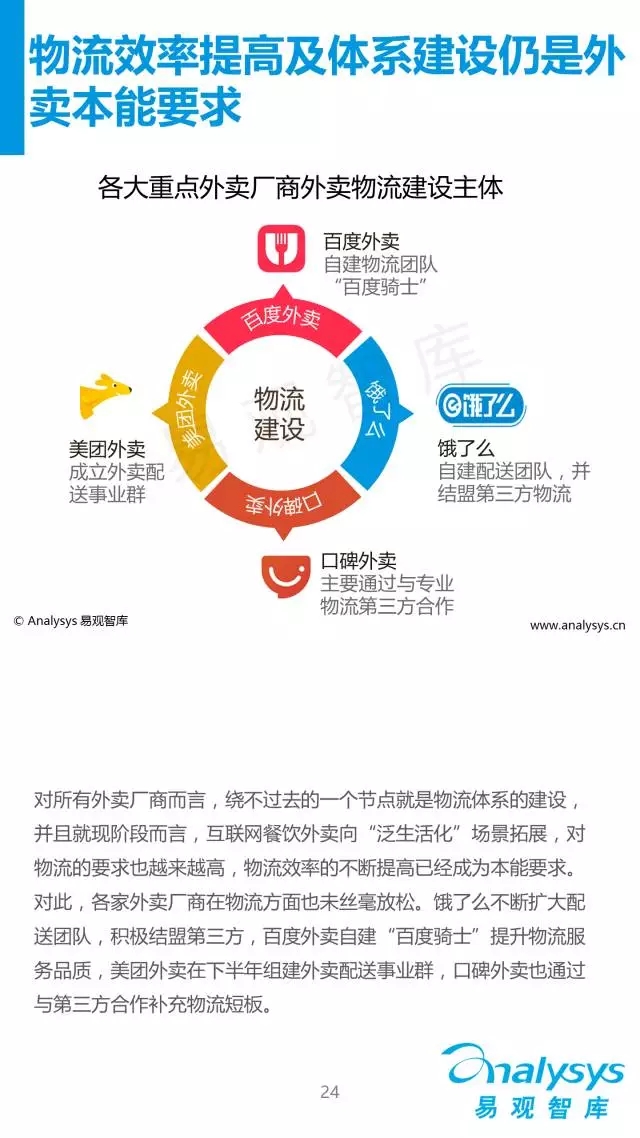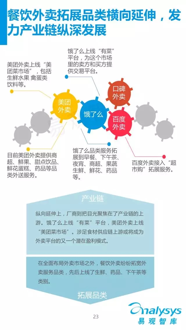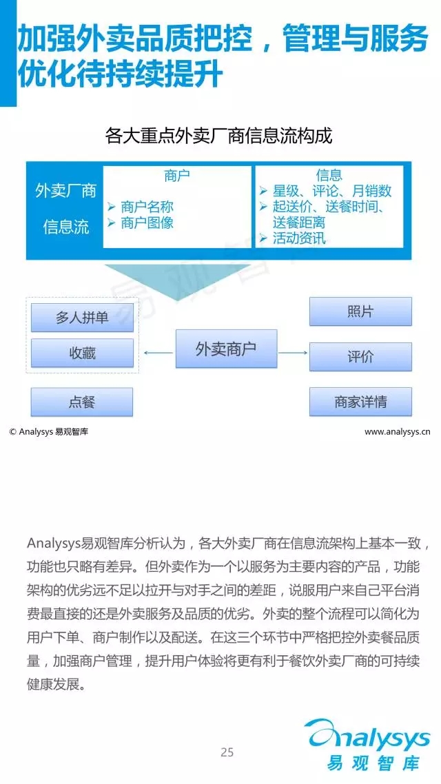 Analysys易观智库分析认为,各大外卖厂商在信息流架构上基本一致,功能也只略有差异。但外卖作为一个以服务为主要内容的产品,功能架构的优劣远不足以拉开与对手之间的差距,说服用户来自己平台消费最直接的还是外卖服务及品质的优劣。外卖的整个流程可以简化为用户下单、商户制作以及配送。在这三个环节中严格把控外卖餐品质量,加强商户管理,提升用户体验将更有利于餐饮外卖厂商的可持续健康发展。