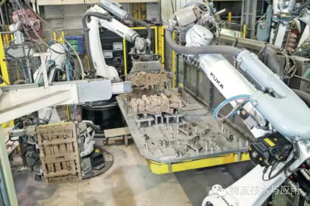 组装线上的第一台机器人是KR QUANTEC铸造版机器人。机器人从制芯机中取出全套的砂芯组件,然后将它们放到1号和2号转台上。这些转台随后旋转180度到较小的KR 5arc机器人面前进行组装和去除毛刺。当两个转台都转回原位时,另外3台KR QUANTEC系列的KUKA机器人拾起每个砂芯并将它们放在3号转台上,以便进行下一步的部件装配。再次旋转180度后,另两台KR 300型机器人将完全组装好的整个组件放置好。下一个机器人取走组件并将其移至固定的螺栓紧固站下面。螺栓拧紧后,六轴机器人将组件放在4号转台上,接着旋转将完全组装好的组件送至清洗室进行清洗并沥干,这里由2台KR300型机器人同时负责。清洗完的组件再次被放至转台上旋转90度,送至人工检查站,等工人检查核准后,总装配的最后一个机器人拾起组件并将其放到一个带有8个格子的货架上。待货架上摆满清洗过的湿组件后,货架被送至烘干炉,最后摆放在高货架仓库中的成品区相应的位置。
