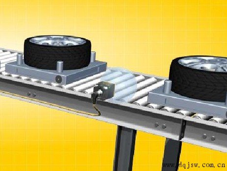 读写器固定在生产线沿线的点或站上,物品或托盘在正常情况下会沿着流水线移动(如下图的轮胎托盘顺着生产滚道移动),当托盘上的RFID标签(图中托盘侧面右边的深色小圆片)经过RFID读写器(图中安装在生产线边上的深色方形小模块)时,读写器就可以读/写标签上的数据,通过电缆到接口模块,然后把信息通过以太网传输到PLC或者计算机(PC)/服务器进行进一步处理,比如通过人机界面(HMI)可以显示物体(轮胎)的相关信息,又比如接到工厂的制造执行系统(MES)/企业资源计划(ERP)/供应链管理(SCM)等系统,实现更高层的控制和管理。