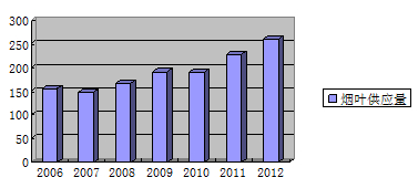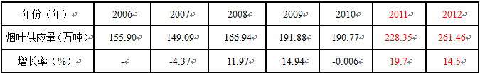 表4:2006年—2012年度烟草原料供应量变化情况(单位:万吨)