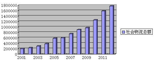 物流总额是指第一次进入全社会物流系统的货物总价值,由于现代物流信息不对称,社会物品流通环节众多,导致了中国现代物流运作中出现货物周转次数多,倒运次数多,滞留在全社会物流系统环节的货物总值高的现象。长期以来就是中国社会物流总额的增长速度远远高于GDP的增长速度,2012年达到177万亿元。当然,物流系统的货物总值高,表明在物流系统中流动的货物也多,货物的搬运、存储、运输的量也十分巨大,带来的对托盘的需求自然巨大。