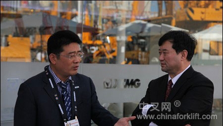 CONEXPO-CONAGG2014徐工展台上中国工程机械工业协会秘书长苏子孟与徐工机械副总裁、徐工进出口公司董事长王岩松(左一)深入交谈