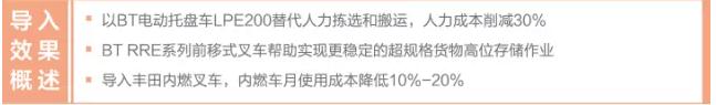 2005年明珠家具开始了和丰田叉车的合作,丰田叉车四川省经销商根据明珠成品库的作业需求和类型,为不同现场先后提案了BT电动托盘车LPE、BT前移式叉车RRE、丰田平衡重叉车FDZN、8FBN和丰田内燃牵引车2TG等多个车型,实现了仓储物流作业各环节的“机械化”和“设备最适用化”,在大幅削减仓储物流成本的同时,最大程度确保了明珠家具仓储物流的“准时化”。