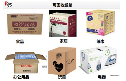 可回收纸箱类型的商品包括:食品、家居、办公用品、玩具、纸巾、电器类。