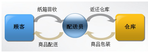 1号店通过在纸箱上印制“感谢您参与纸箱回收,1起环保”来宣传纸箱回收的理念,同时在快递纸箱送达顾客手中的时候快递员当面向顾客宣传公司关于纸箱回收的政策,鼓励顾客将纸箱返还给快递员。顾客每返还一个纸箱可获得50个积分,而积攒的积分可在1号店积分商城中兑换心仪的礼品。配送员收到顾客返还的纸箱后将纸箱集中放置在站点,站点返还给仓库进行二次利用。纸箱循环利用过程见下图: