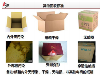 同从客户那里回收纸箱一样,内部纸箱回收也制定二手纸箱回收使用的标准,有气味纸箱(如香皂箱等),有破损纸箱,装化学物品纸箱(如洗衣液箱、消毒液箱等),装敏感商品纸箱均(如卫生巾箱等),均不得再次进行利用。通过使用二手纸箱减少资源的浪费,节约企业的运作成本。